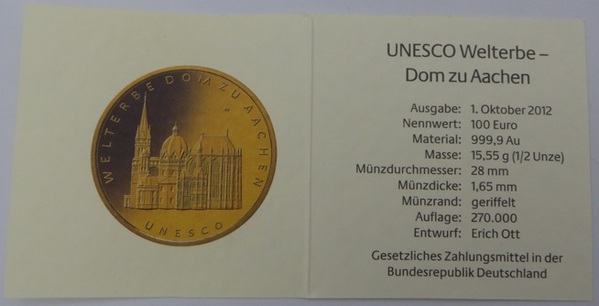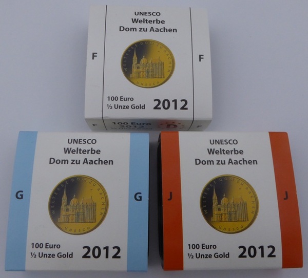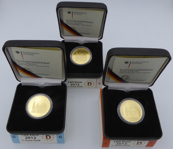 3 x 100 € Gold 2012, ½ Unze Feingold "Dom zu Aachen", aus der 16-teiligen Serie "Unesco Weltkulturerbe" der Prägestätten F (Stuttgart), G (Karlsruhe) und J (Hamburg) mit Original-Echtheitszertifikat der Verkaufsstelle für Sammlermünzen (VfS) und in der Originalen dunkelblauen Box. Die Auflagenhöhe liegt mit 270.000 Stück für alle 5 Prägestätten (also 54.000 Je Prägestätte) war in 2012 erstmals seit Prägung von Euro-Goldmünzen unter 300.000 Stück.