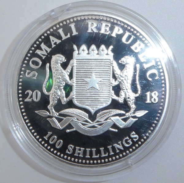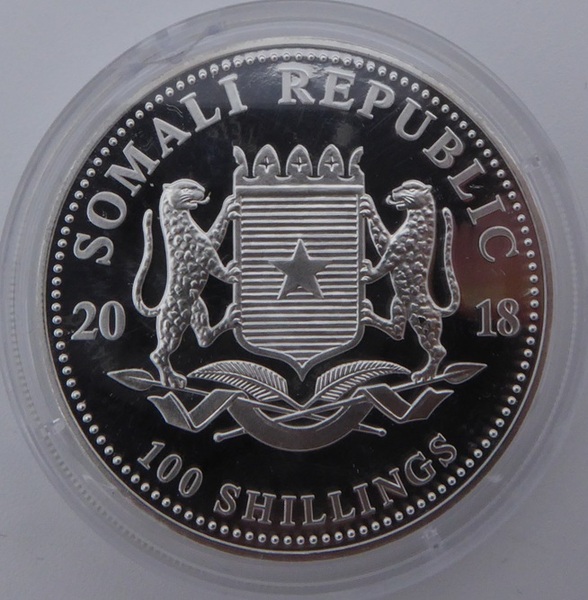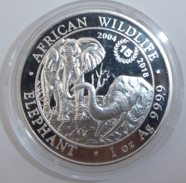 100 Shillings 1 Unze Feinsilbermünze „Elephant“ der Serie „African Wildlife“ aus Somalia aus 2016 als Jubiläumsausgabe zum 15-jährigen Jubiläum mit niedriger Auflage. Beim Bild der Münze wurden die Bilder der Erstausgabe von 2004 mit dem aktuellen Motiv aus 2018 kombiniert dargestellt. Rechts oben befindet sich ergänzend die Angabe „2004 ´15` 2018“Sie hat den Feinheitsgrad von 999 tausendstel Silber und wird in der originalen Münzkapsel ausgegeben. Das Münzbild des Elefanten variiert jährlich. Die Münze hat das Gewicht von 1 Unze und wurde für Somalia von der Münzprägestätte München geprägt.